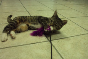 Macie loves her feather toy!